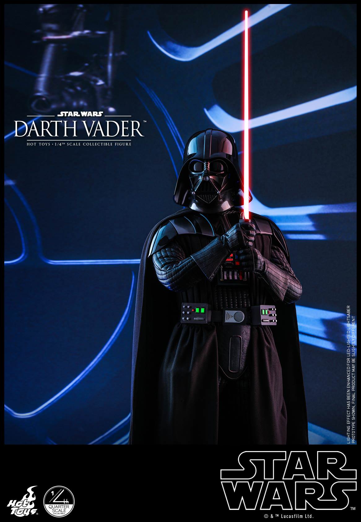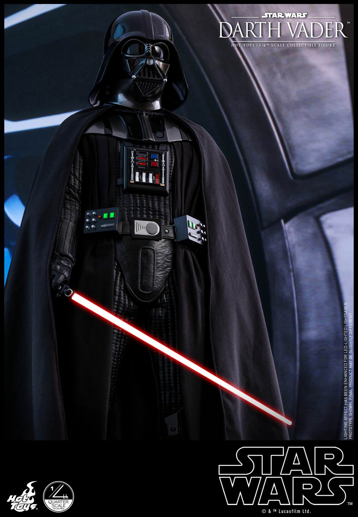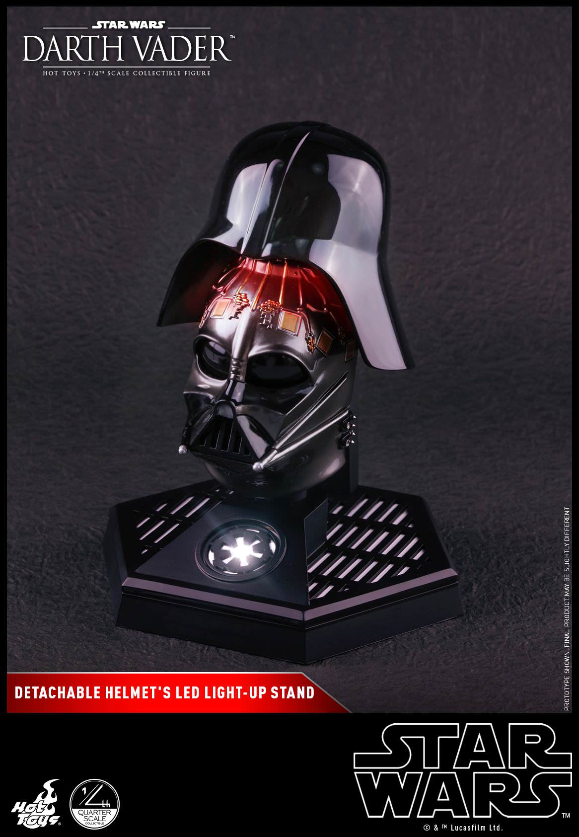 This highly-accurate quarter-scale collectible figure is sophisticatedly developed based on the appearance of Darth Vader featuring a incredibly meticulous helmet with interior mechanical details, a newly developed unmasked head sculpt with amazing likeness, faithfully recreated Darth Vader armor and outfit with LED lighted chest panel and belt boxes, LED light-up lightsaber, interchangeable severed gauntlet and hand, as well as a LED light-up Death Star themed figure stand!