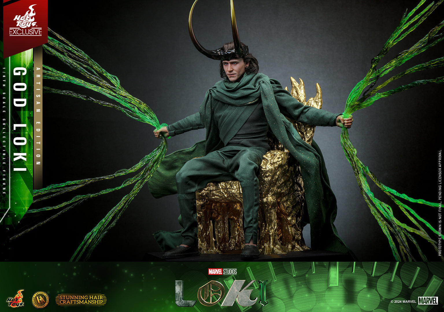 Exquisitely crafted based on the screen appearance of Tom Hiddleston as God Loki in the last appearance in MCU, the figure features a newly developed head sculpt with separate rolling eyeballs. The fabric costume has been finely tailored to match Loki's on-screen appearance, ensuring an accurate and visually stunning portrayal. His iconic horned helmet is magnetically attachable, completing the authentic look. Additionally, a throne, timeline effects, hand effects, themed backdrop, and a display base to enhance the display options and allow for creative posing.