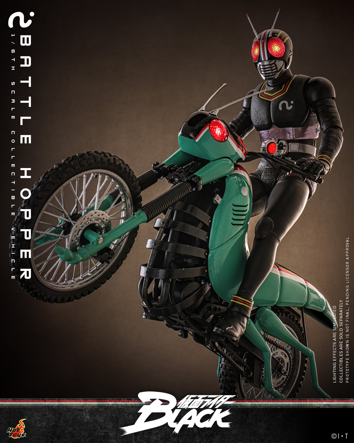 Hot Toys is thrilled to present the 1/6th scale Battle Hopper Collectible Vehicle, a faithful and finely detailed tribute to this iconic Rider Machine. Measuring approximately 36 cm long, 14 cm wide, and 21 cm tall, the model showcases authentic mechanical features, from the engine, frame, and exhaust to side stands. Battle Hopper is finely painted in shiny green, red, and white color schemes. The grasshopper-inspired exterior includes long antennae, grasshopper legs, and headlights with LED-lit red light that imitates the eyes. Features such as rear spring suspension and rotatable wheels with dirt-weathered tires show expert craftsmanship.